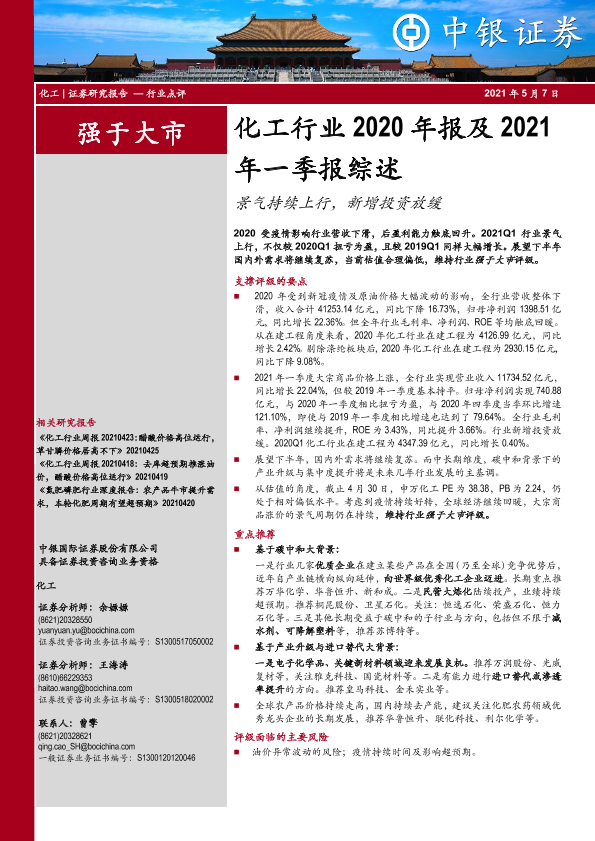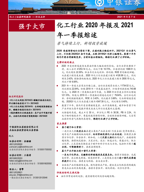【中银证券】【20210507】化工行业2020年报及2021年一季报综述:景气持续上行,新增投资放缓-20页
