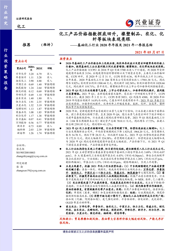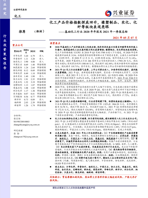 【兴业证券】【20210507】基础化工行业2020年年报及2021年一季报总结:化工产品价格指数探底回升,橡塑制品、农化、化纤等板块表现亮眼-51页