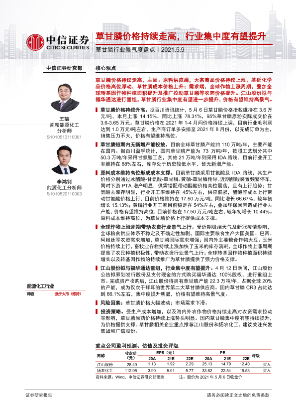 【中信证券】【20210509】草甘膦行业景气度盘点:草甘膦价格持续走高,行业集中度有望提升-2页