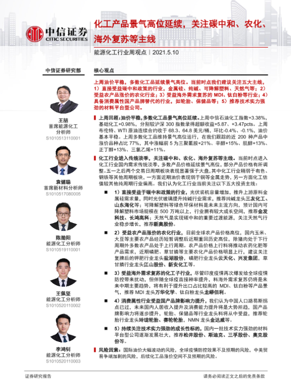 【中信证券】【20210510】能源化工行业周观点:化工产品景气高位延续,关注碳中和、农化、海外复苏等主线-3页