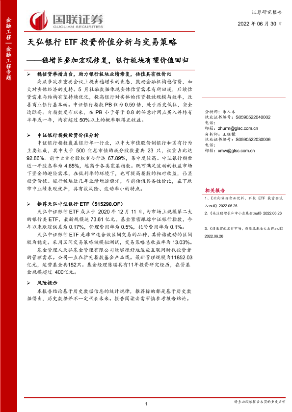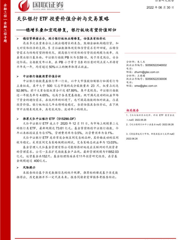 【国联证券】【20220630】天弘银行ETF投资价值分析与交易策略:稳增长叠加宏观修复,银行板块有望价值回归-22页