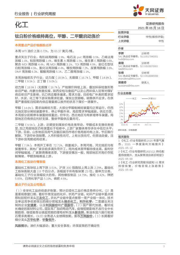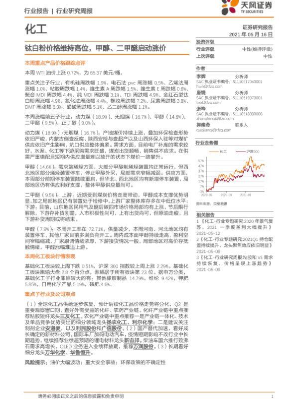 【天风证券】【20210516】20210516-天风证券-化工行业研究周报:钛白粉价格维持高位,甲醇、二甲醚启动涨价-21页