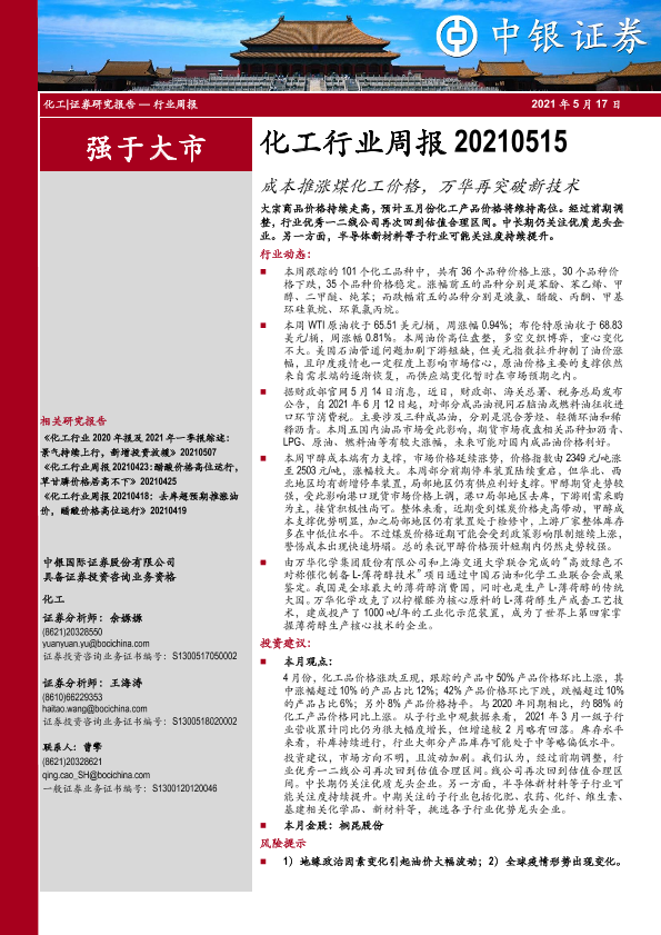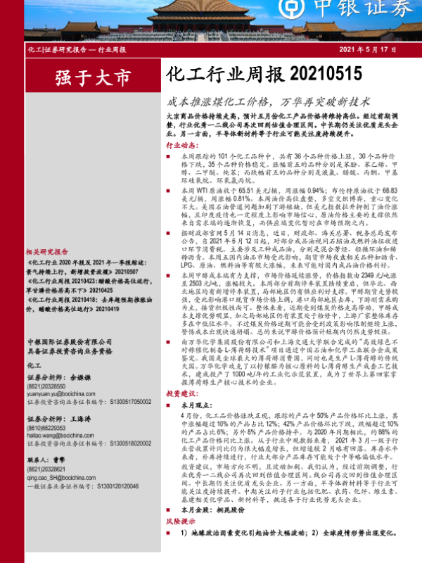 【中银证券】【20210517】20210517-中银证券-化工行业周报:成本推涨煤化工价格,万华再突破新技术-11页