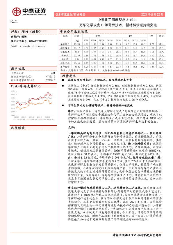 【中泰证券】【20210522】中泰化工周度观点21W21:万华化学攻克L-薄荷醇技术,新材料领域持续突破-25页
