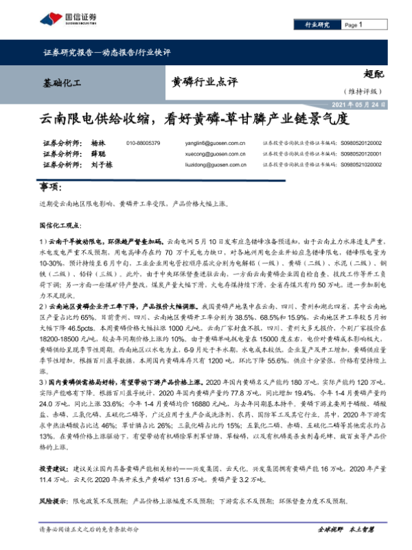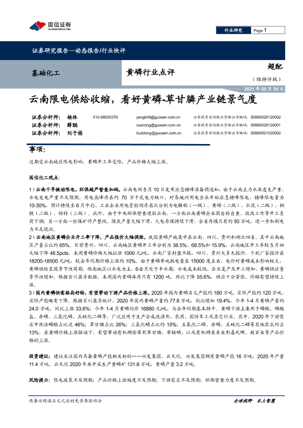 【国信证券】【20210524】国信证券-黄磷行业点评:云南限电供给收缩,看好黄磷-草甘膦产业链景气度-5页