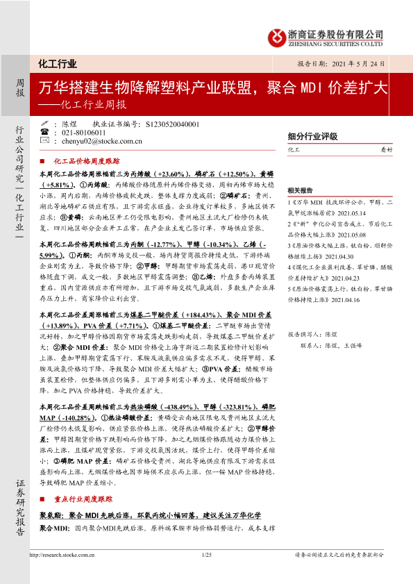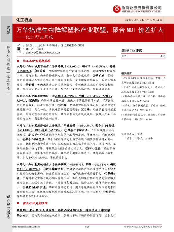 【浙商证券】【20210524】20210524-浙商证券-化工行业周报:万华搭建生物降解塑料产业联盟,聚合MDI价差扩大-25页