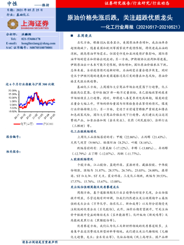 【上海证券】【20210525】20210525-上海证券-化工行业周报:原油价格先涨后跌,关注超跌优质龙头-13页