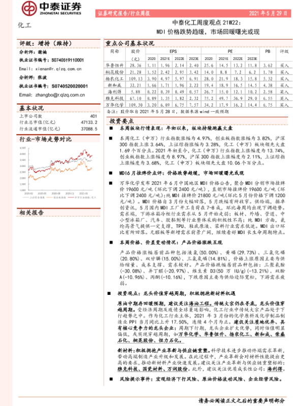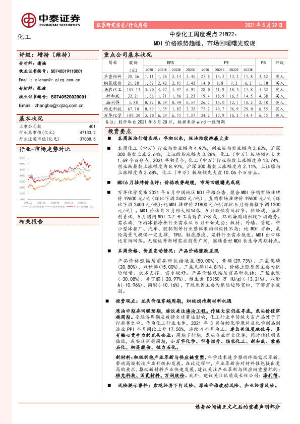 【中泰证券】【20210529】中泰化工周度观点21W22:MDI价格跌势趋缓,市场回暖曙光或现-28页