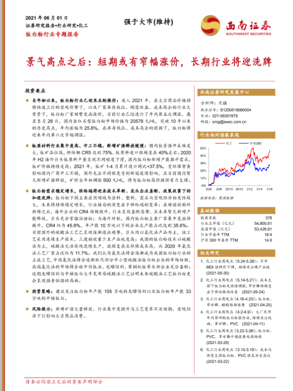 【西南证券】【20210601】20210601-西南证券-钛白粉行业专题报告:景气高点之后:短期或有窄幅涨价,长期行业将迎洗牌-31页