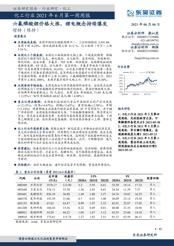【东吴证券】【20210606】化工行业2021年6月第一周周报:六氟磷酸锂价格大涨,锂电概念持续爆发-11页