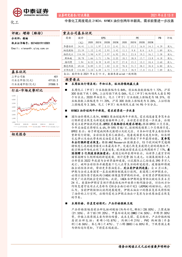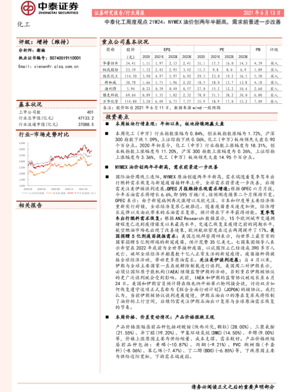 【中泰证券】【20210613】中泰化工周度观点21W24:NYMEX油价创两年半新高,需求前景进一步改善-27页