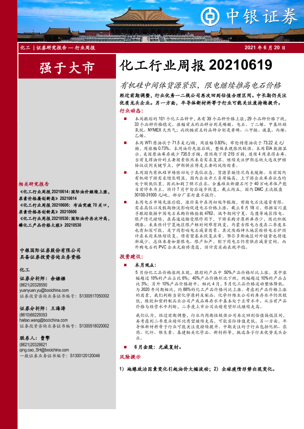 【中银证券】【20210620】20210620-中银证券-化工行业周报:有机硅中间体货源紧张,限电继续推高电石价格-11页