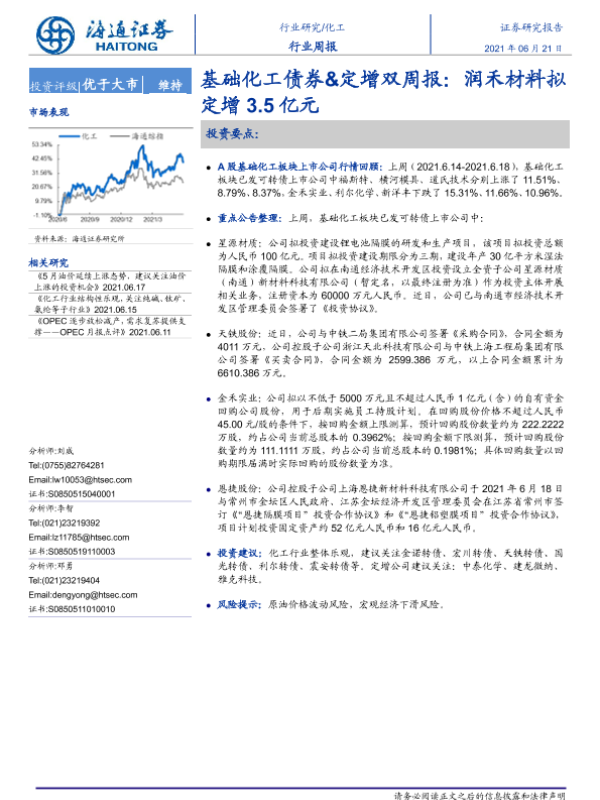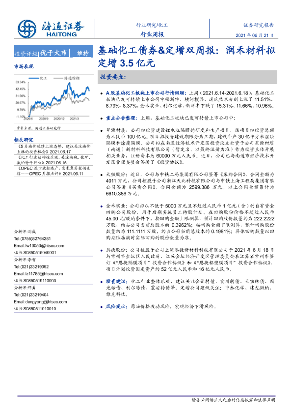 【海通证券】【20210621】基础化工债券&定增双周报:润禾材料拟定增3.5亿元-14页