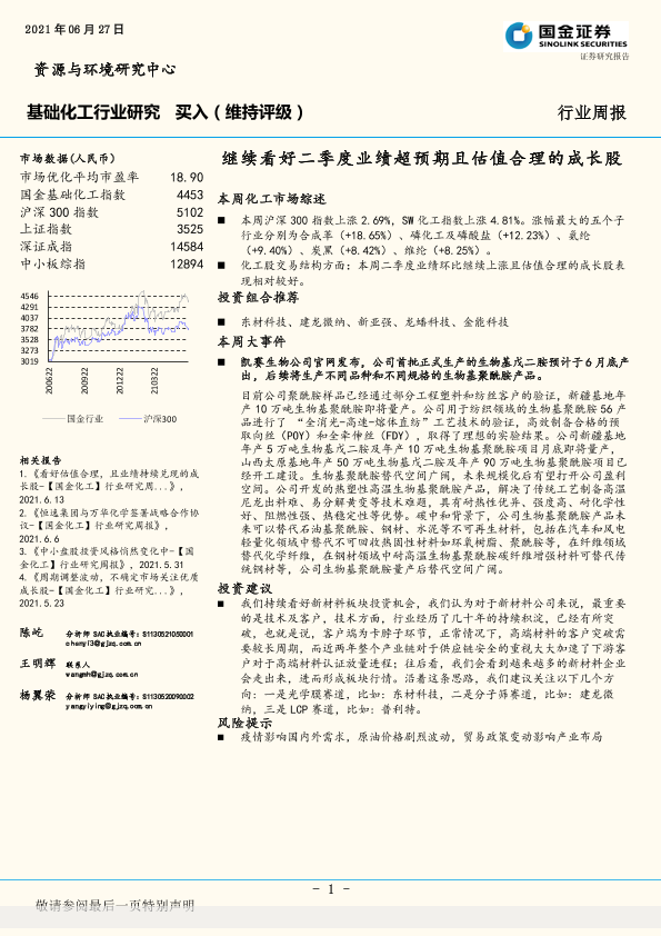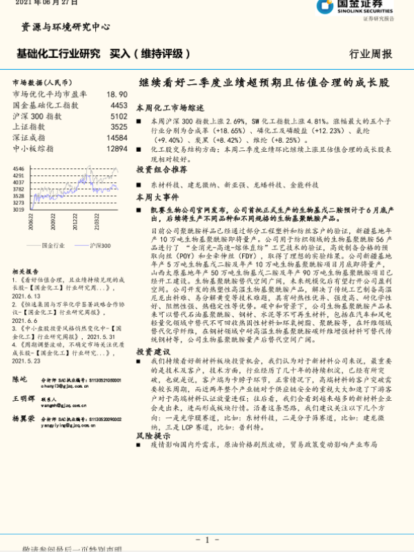 【国金证券】【20210627】基础化工行业研究行业周报:继续看好二季度业绩超预期且估值合理的成长股-18页