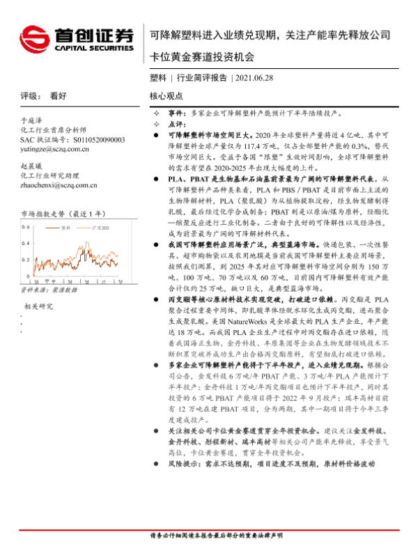 【首创证券】【20210628】20210628-首创证券-塑料行业简评报告:可降解塑料进入业绩兑现期,关注产能率先释放公司卡位黄金赛道投资机会-4页