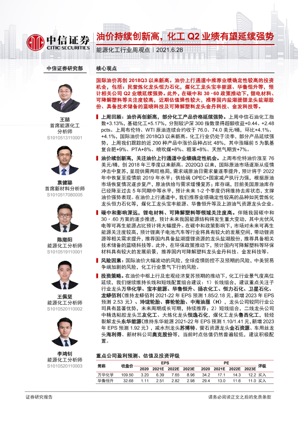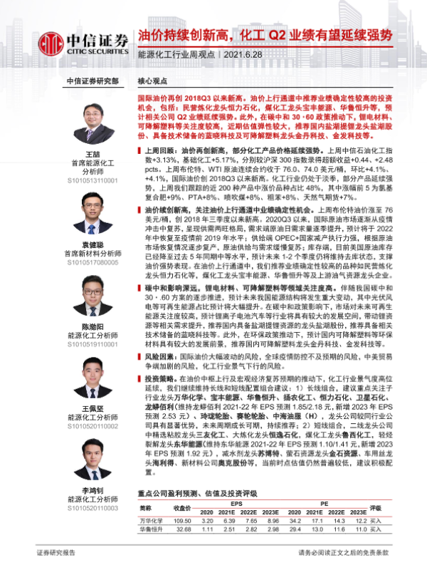 【中信证券】【20210628】20210628-中信证券-能源化工行业周观点:油价持续创新高,化工Q2业绩有望延续强势-3页