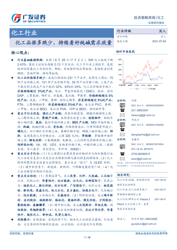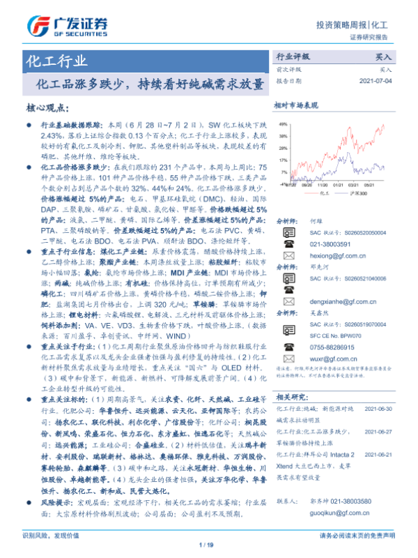 【广发证券】【20210704】20210704-广发证券-化工行业投资策略周报:化工品涨多跌少,持续看好纯碱需求放量-19页
