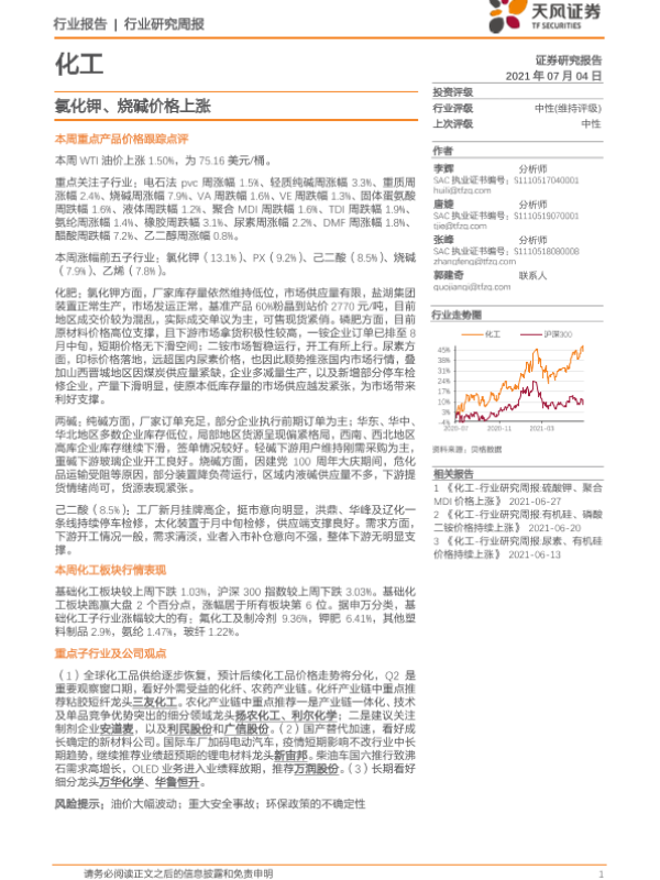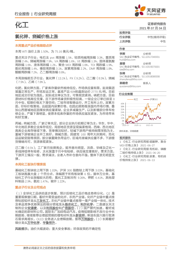 【天风证券】【20210704】20210704-天风证券-化工行业研究周报:氯化钾、烧碱价格上涨-21页