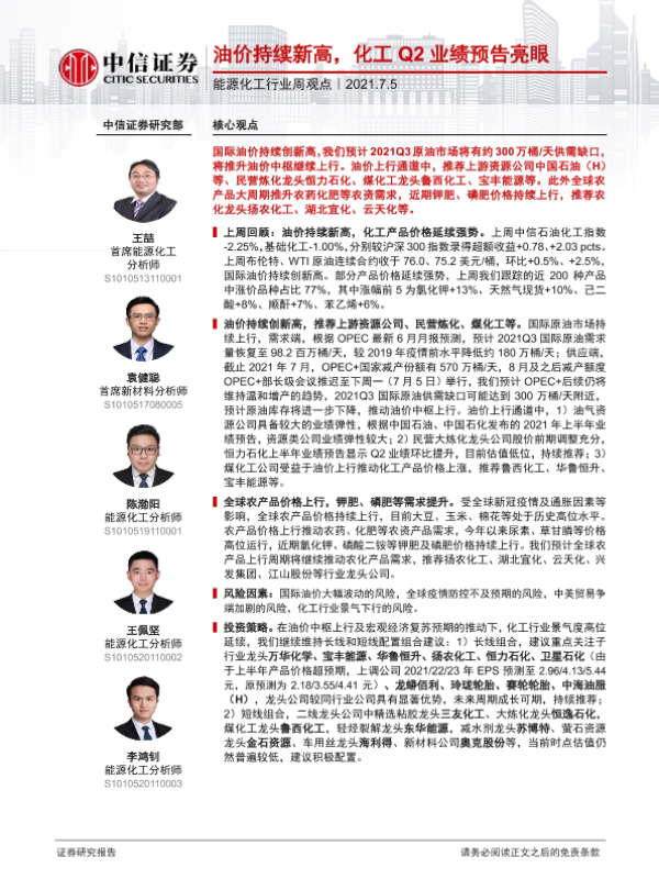 【中信证券】【20210705】20210705-中信证券-能源化工行业周观点:油价持续新高,化工Q2业绩预告亮眼-3页