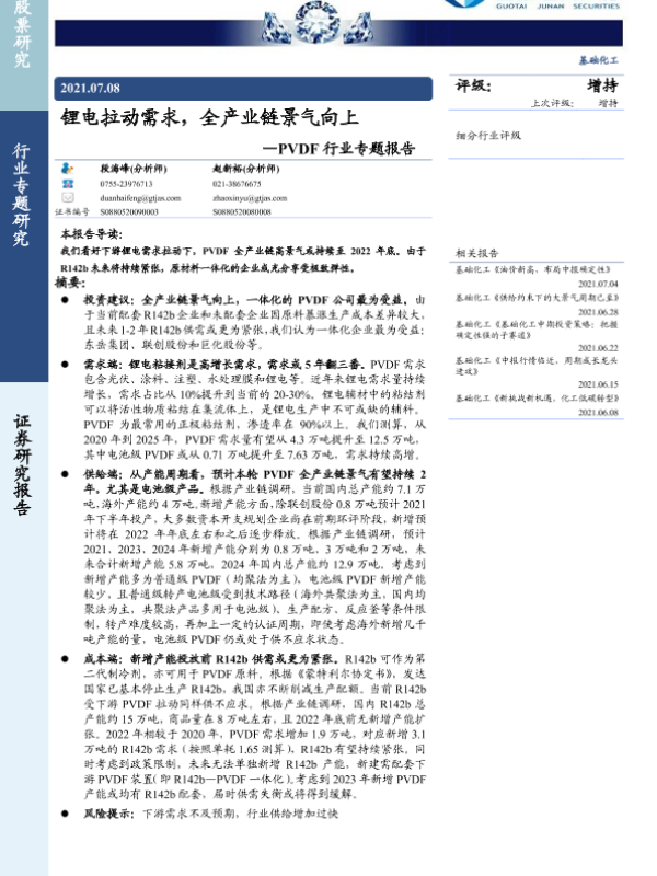 【国泰君安证券】【20210708】PVDF行业专题报告:锂电拉动需求,全产业链景气向上-7页