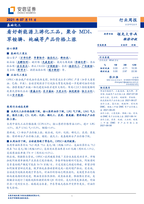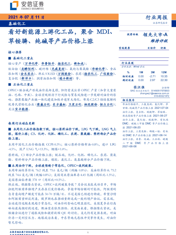 【安信证券】【20210711】基础化工行业周报:看好新能源上游化工品,聚合MDI、草铵膦、纯碱等产品价格上涨-5页