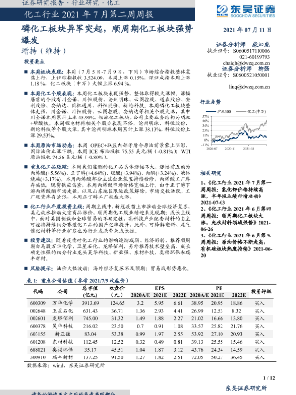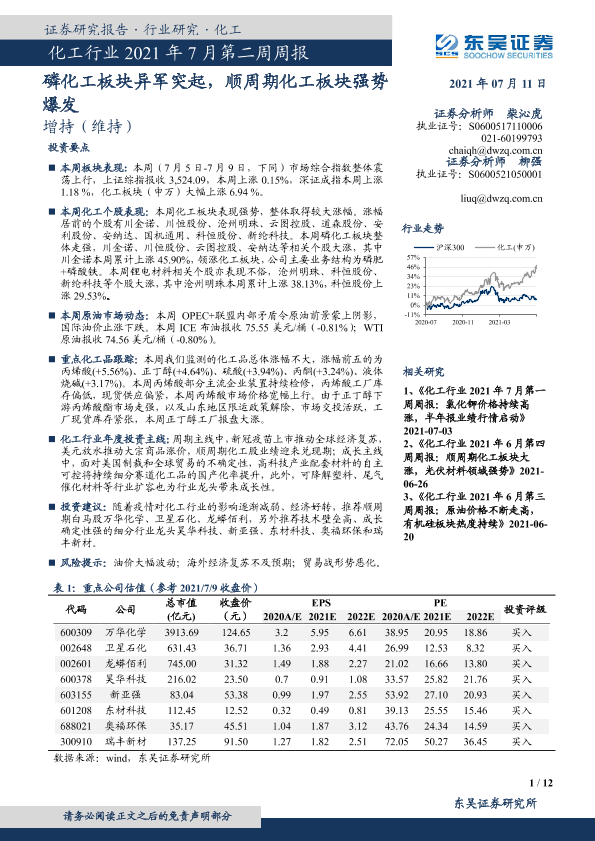 【东吴证券】【20210711】化工行业2021年7月第二周周报:磷化工板块异军突起,顺周期化工板块强势爆发-12页