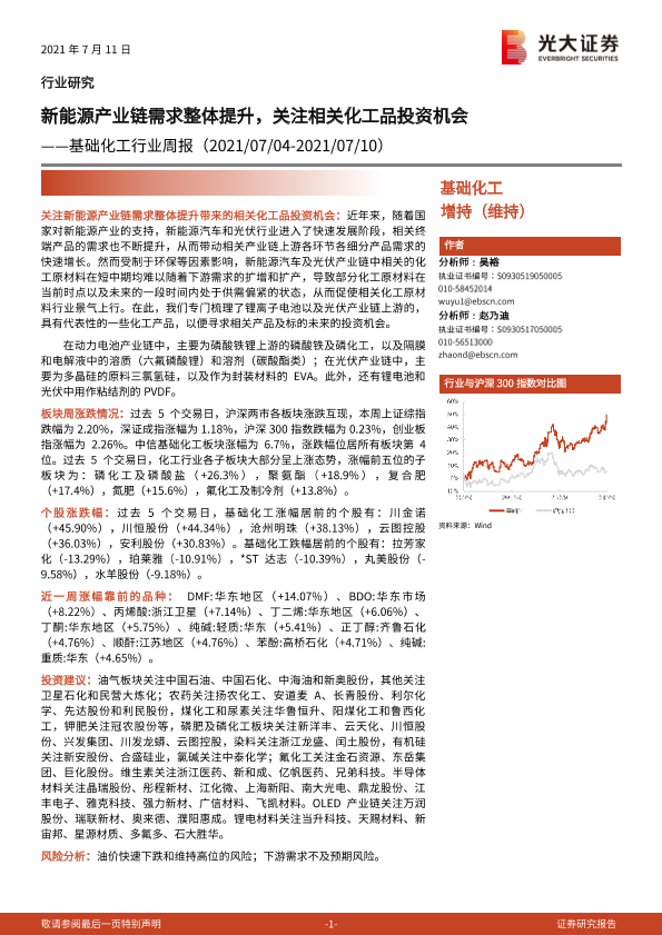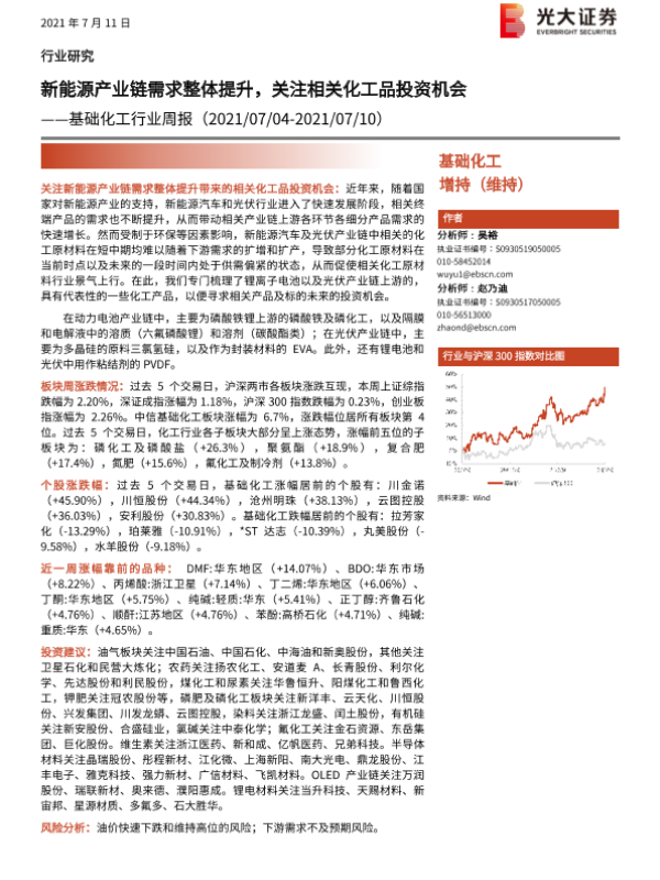 【光大证券】【20210711】基础化工行业周报:新能源产业链需求整体提升,关注相关化工品投资机会-24页
