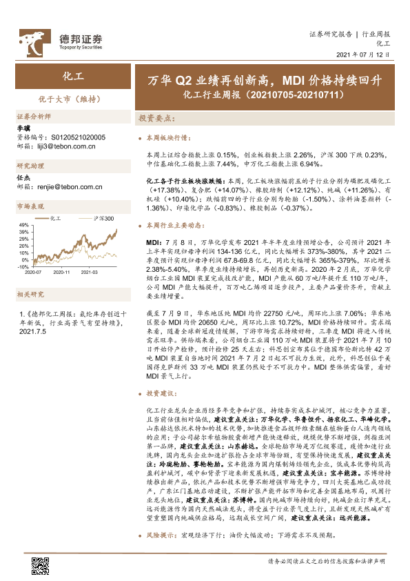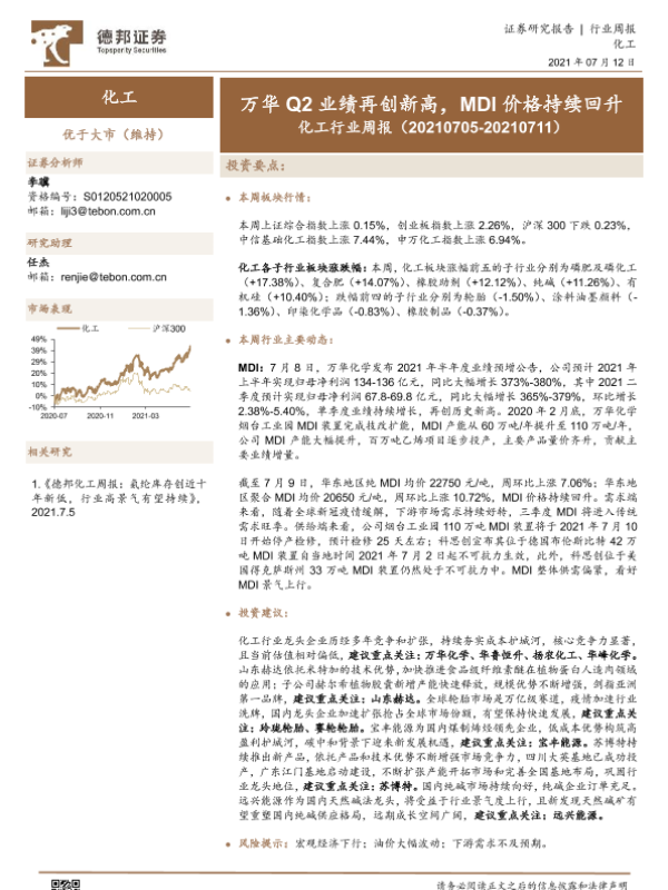 【德邦证券】【20210712】20210712-德邦证券-化工行业周报:万华Q2业绩再创新高,MDI价格持续回升-21页