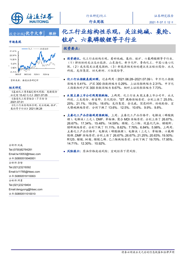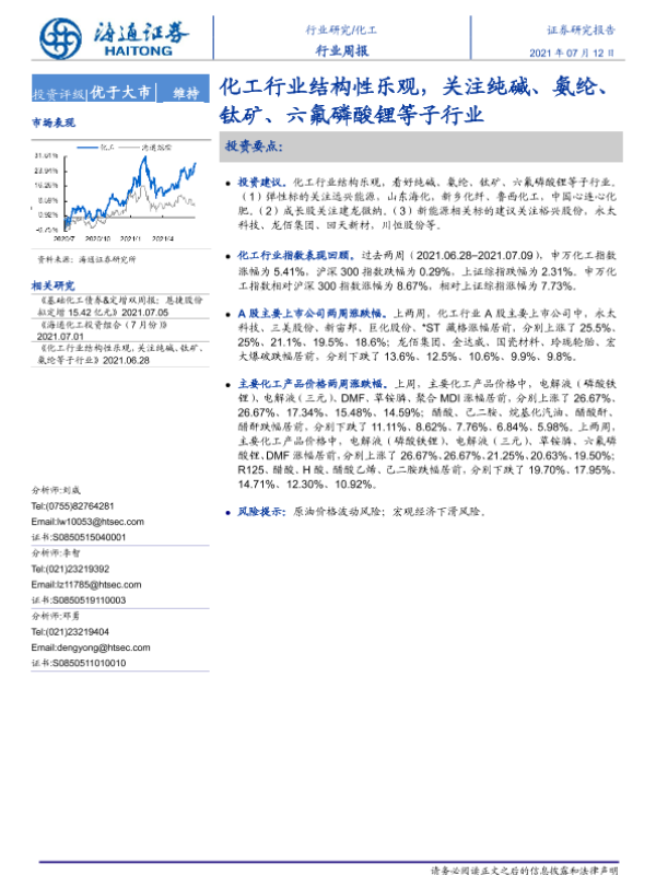 【海通证券】【20210712】20210712-海通证券-化工行业周报:化工行业结构性乐观,关注纯碱、氨纶、钛矿、六氟磷酸锂等子行业-18页