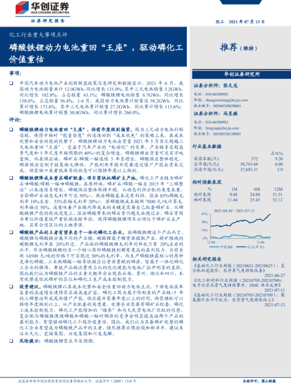 【华创证券】【20210713】化工行业重大事项点评:磷酸铁锂动力电池重回“王座”,驱动磷化工价值重估-4页