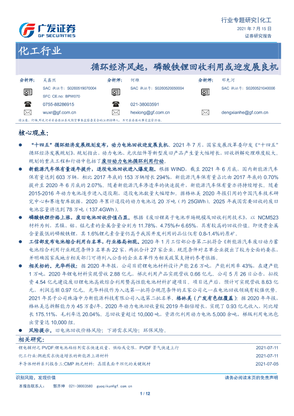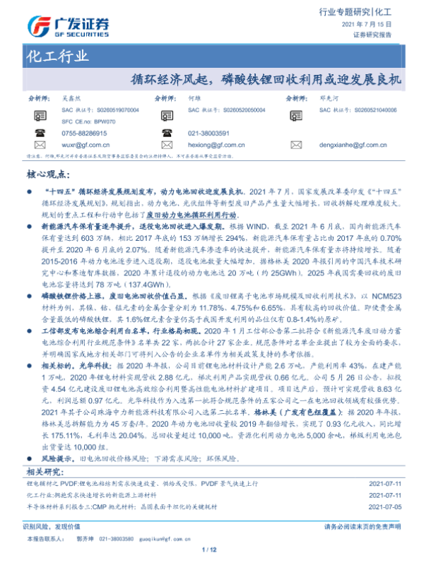 【广发证券】【20210715】20210715-广发证券-化工行业专题研究:循环经济风起,磷酸铁锂回收利用或迎发展良机-12页