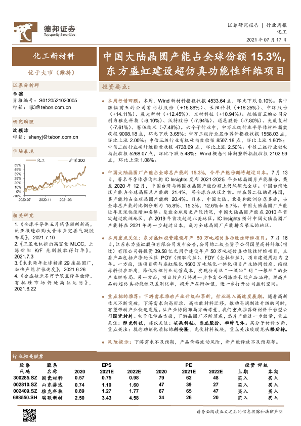 【德邦证券】【20210717】20210717-德邦证券-化工新材料行业:中国大陆晶圆产能占全球份额15.3%,东方盛虹建设超仿真功能性纤维项目-16页
