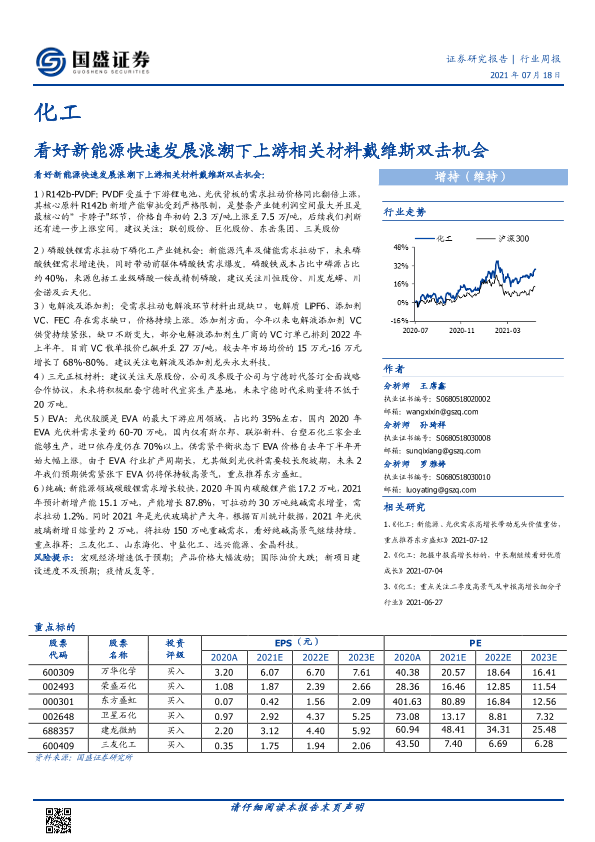【国盛证券】【20210718】20210718-国盛证券-化工行业周报:看好新能源快速发展浪潮下上游相关材料戴维斯双击机会-10页