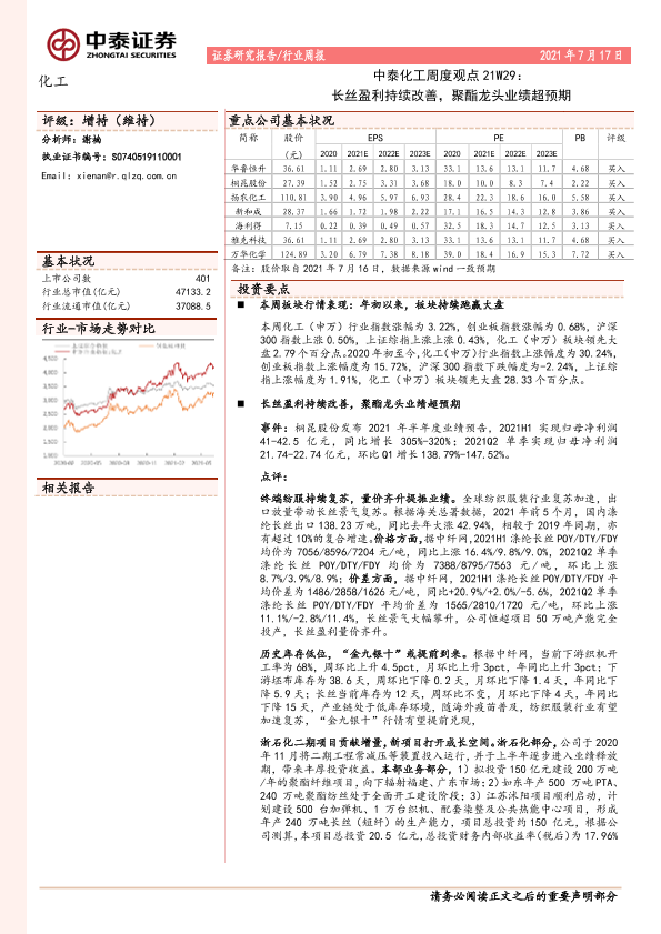 【中泰证券】【20210717】中泰化工周度观点21W29:长丝盈利持续改善,聚酯龙头业绩超预期-27页
