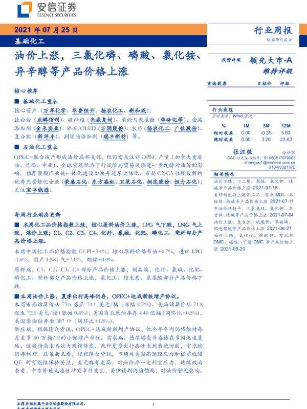 【安信证券】【20210725】基础化工行业周报:油价上涨,三氯化磷、磷酸、氯化铵、异辛醇等产品价格上涨-4页