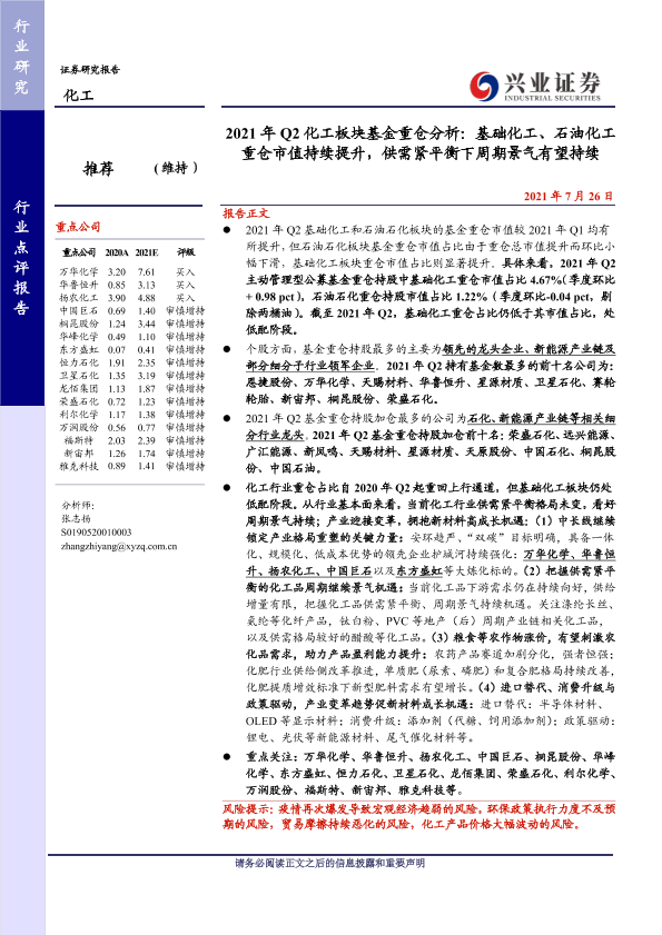 【兴业证券】【20210726】2021年Q2化工板块基金重仓分析:基础化工、石油化工重仓市值持续提升,供需紧平衡下周期景气有望持续-9页