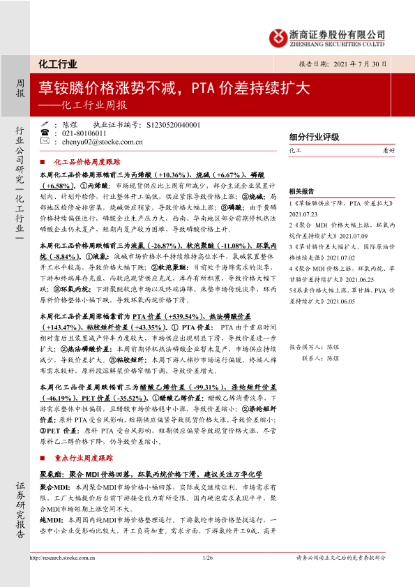 【浙商证券】【20210730】20210730-浙商证券-化工行业周报:草铵膦价格涨势不减,PTA价差持续扩大-26页