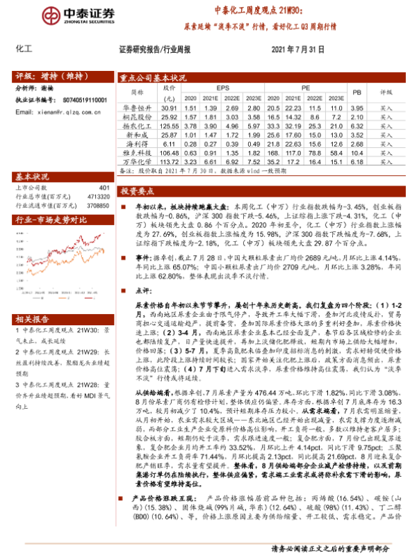 【中泰证券】【20210731】中泰化工周度观点21W30:尿素延续“淡季不淡”行情,看好化工Q3周期行情-25页