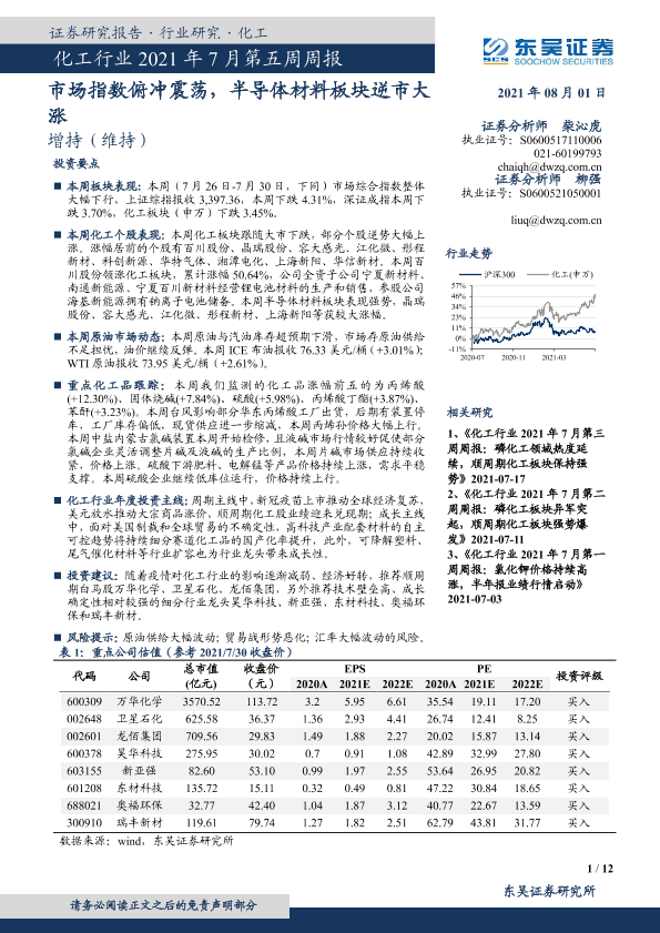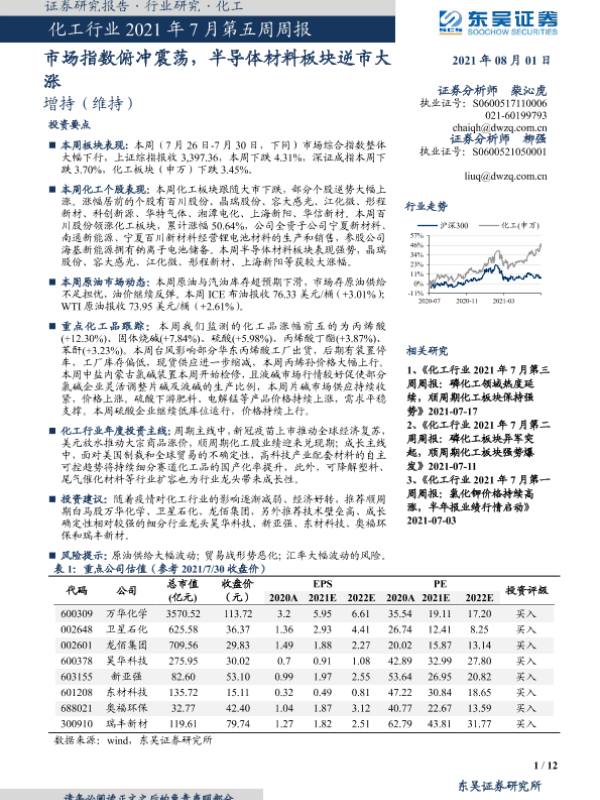 【东吴证券】【20210801】化工行业2021年7月第五周周报:市场指数俯冲震荡,半导体材料板块逆市大涨-12页