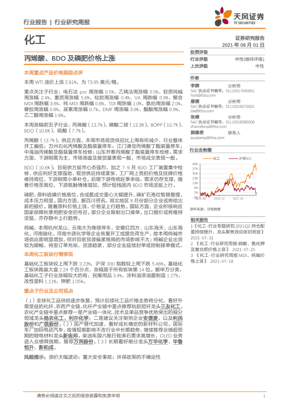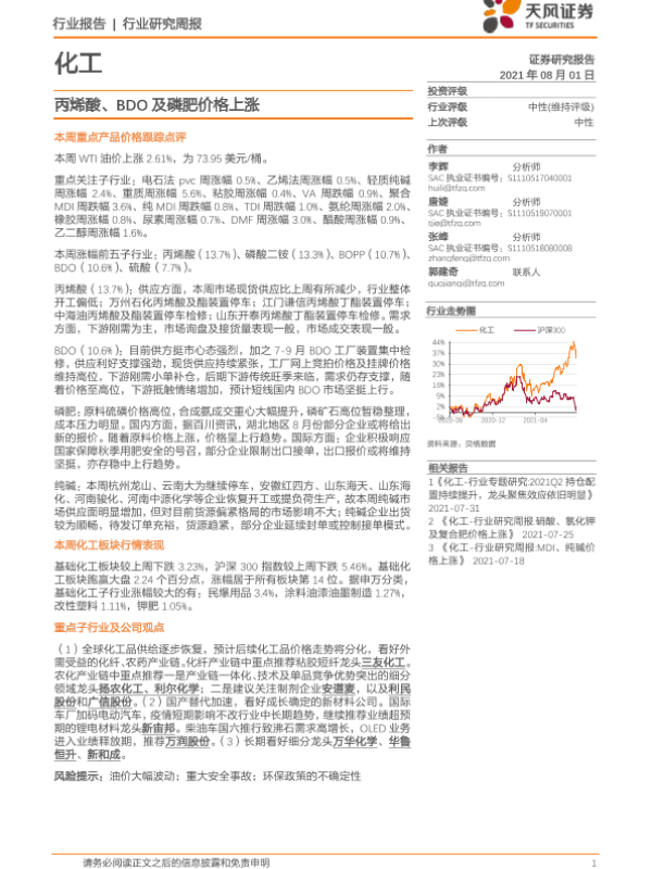 【天风证券】【20210801】20210801-天风证券-化工行业研究周报:丙烯酸、BDO及磷肥价格上涨-21页