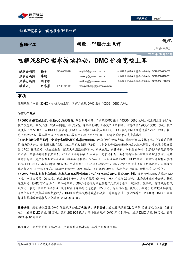 【国信证券】【20210805】20210805-国信证券-碳酸二甲酯行业点评:电解液&PC需求持续拉动,DMC价格宽幅上涨-5页