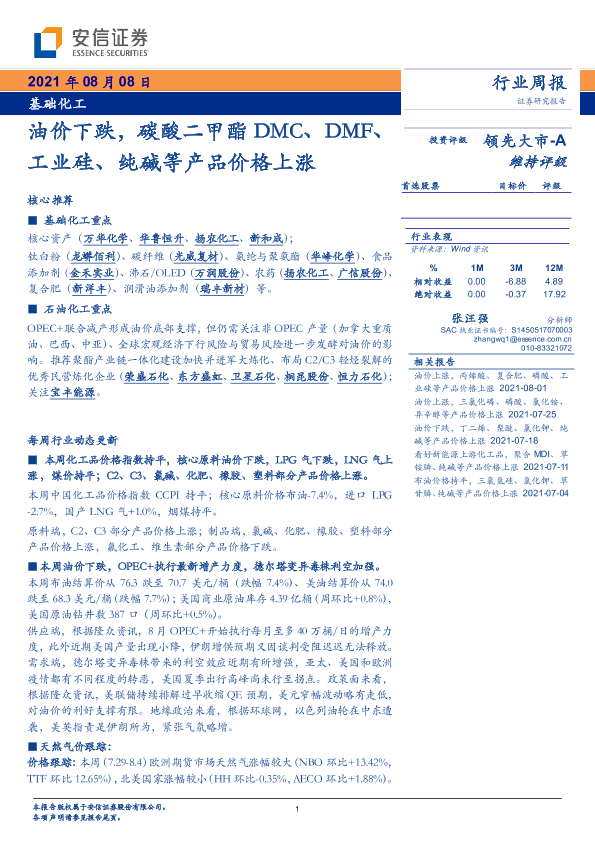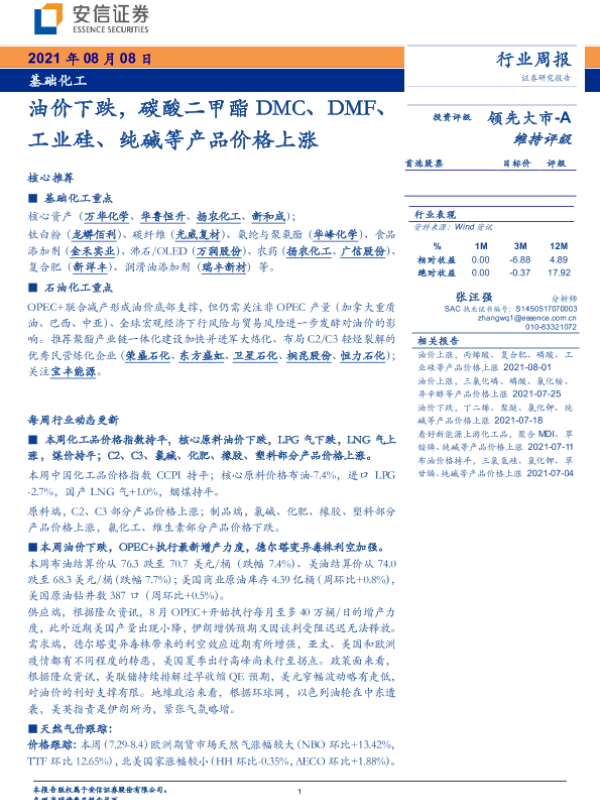 【安信证券】【20210808】基础化工行业周报:油价下跌,碳酸二甲酯DMC、DMF、工业硅、纯碱等产品价格上涨-5页