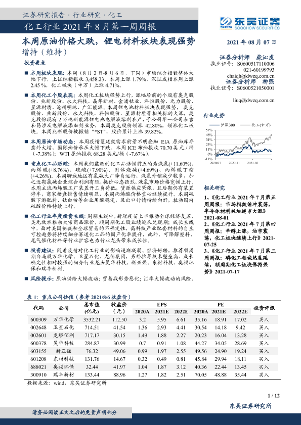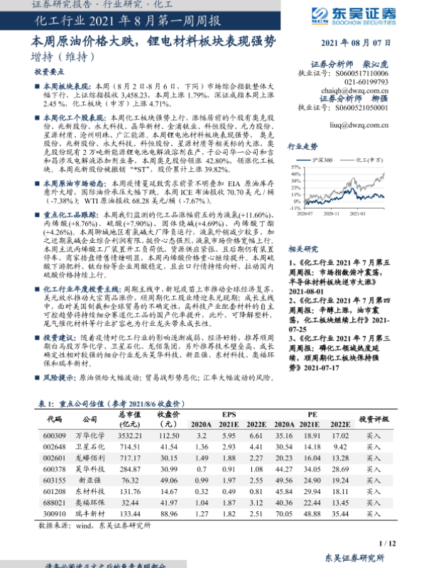 【东吴证券】【20210807】化工行业2021年8月第一周周报:本周原油价格大跌,锂电材料板块表现强势-12页