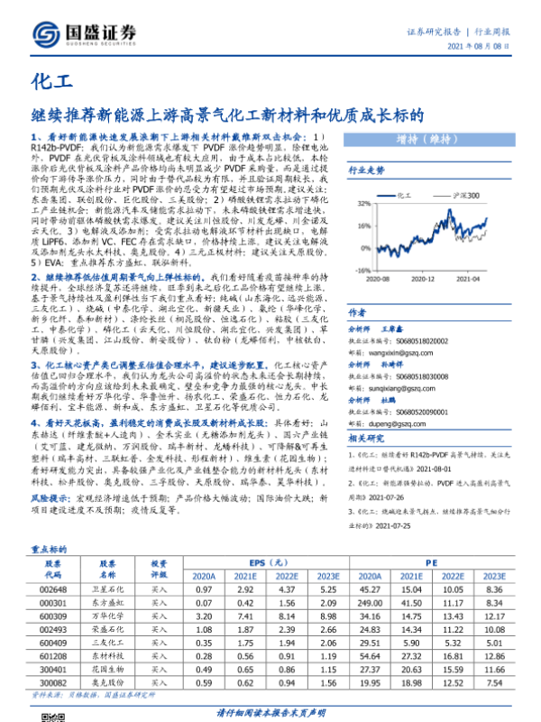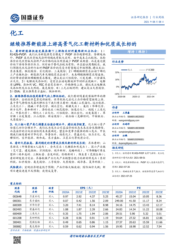 【国盛证券】【20210808】20210808-国盛证券-化工行业周报:继续推荐新能源上游高景气化工新材料和优质成长标的-12页