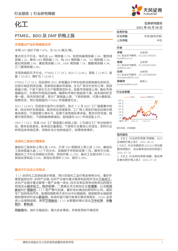 【天风证券】【20210808】20210808-天风证券-化工行业研究周报:PTMEG、BDO及DMF价格上涨-21页