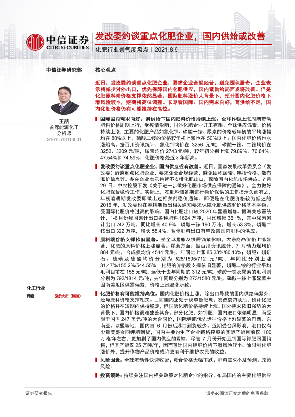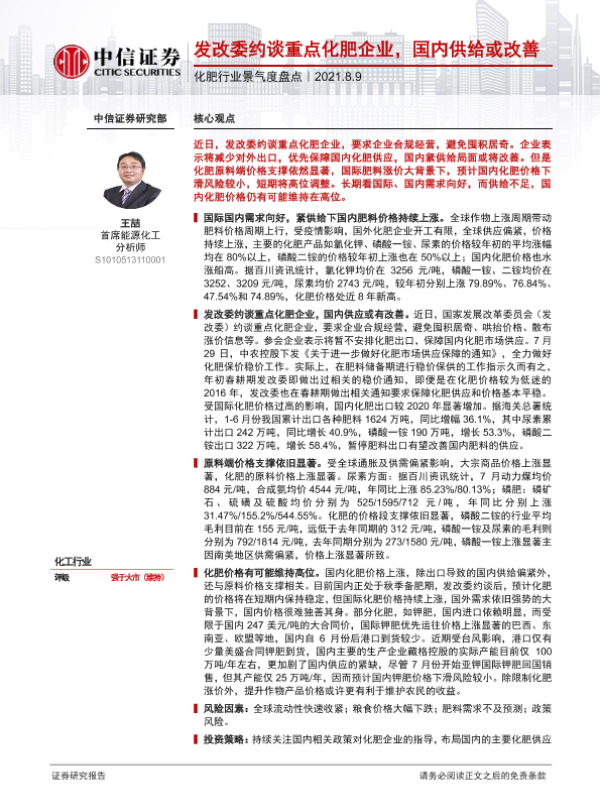 【中信证券】【20210809】20210809-中信证券-化肥行业景气度盘点:发改委约谈重点化肥企业,国内供给或改善-3页