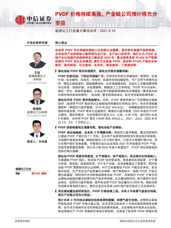 【中信证券】【20210810】20210810-中信证券-能源化工行业重大事项点评:PVDF价格持续高涨,产业链公司预计将充分受益-3页