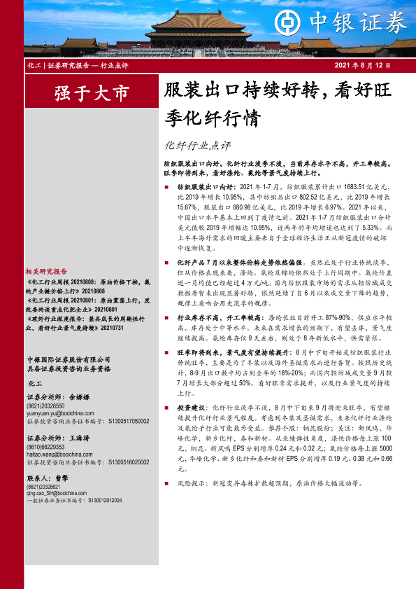 【中银证券】【20210812】20210812-中银证券-化纤行业点评:服装出口持续好转,看好旺季化纤行情-11页