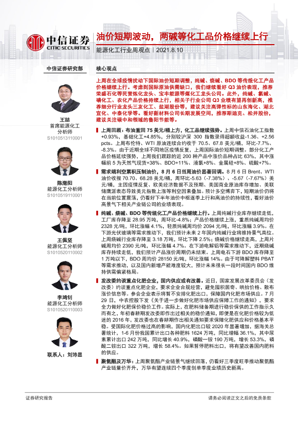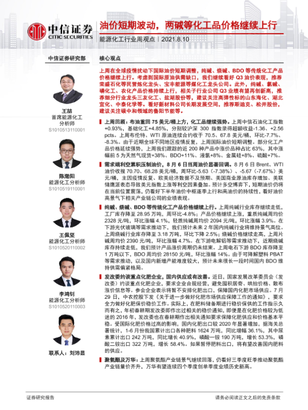 【中信证券】【20210810】20210810-中信证券-能源化工行业周观点:油价短期波动,两碱等化工品价格继续上行-15页