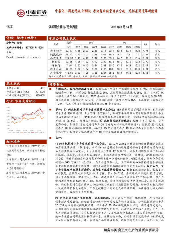【中泰证券】【20210814】中泰化工周度观点21W33:原油需求前景存在分歧,龙佰集团进军新能源-25页